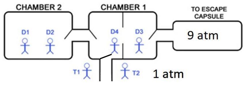 에드윈 카워드와 로이 루카스, 비욘 베르게슨(D1~D3) 이렇게 세명은 9기압의 신체 내부압력 상태에서 순간적으로 1기압에 노출되어 폭발성 감압 현상을 겪게 된다.
